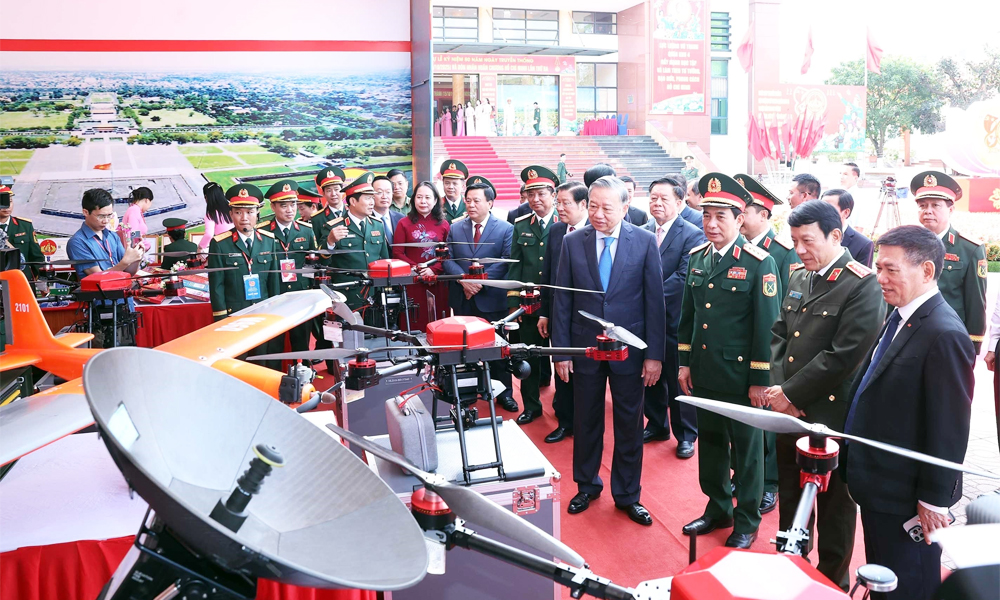 Tổng Bí thư Tô Lâm và các đồng chí lãnh đạo Đảng, Nhà nước tham quan trưng bày tại lễ kỷ niệm. |