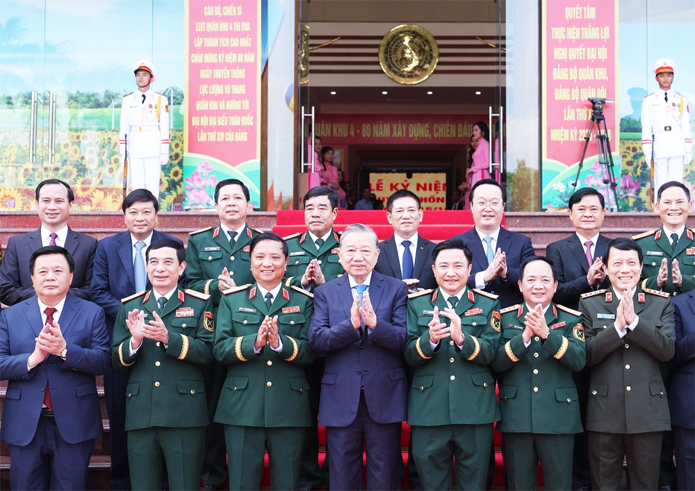 Tổng Bí thư Tô Lâm, Bí thư Quân ủy Trung ương dự và phát biểu chỉ đạo. Các Ủy viên Bộ Chính trị: Chủ tịch nước Lương Cường, Thủ tướng Chính phủ Phạm Minh Chính, Chủ tịch Quốc hội Trần Thanh Mẫn; các cơ quan, đơn vị và địa phương gửi lẵng hoa chúc mừng 80 năm Ngày truyền thống Lực lượng vũ trang Quân khu 4.