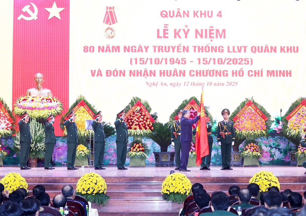 Sáng 12/10, tại Nghệ An, Đảng ủy, Bộ Tư lệnh Quân khu 4, Bộ Quốc phòng đã tổ chức trọng thể Lễ kỷ niệm 80 năm Ngày truyền thống Lực lượng vũ trang Quân khu 4 (15/10/1945-15/10/2025) và đón nhận Huân chương Hồ Chí Minh.