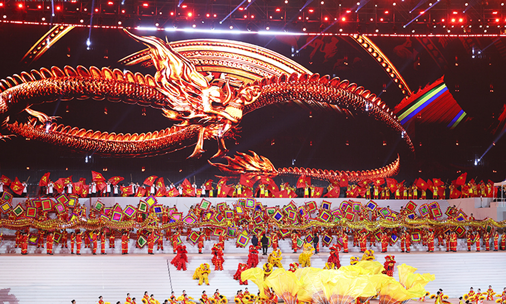 Màn trình diễn rồng nghệ thuật kết hợp đồ họa sân khấu hiện đại, tái hiện khát vọng vươn lên mạnh mẽ của dân tộc Việt Nam trong kỷ nguyên mới. |