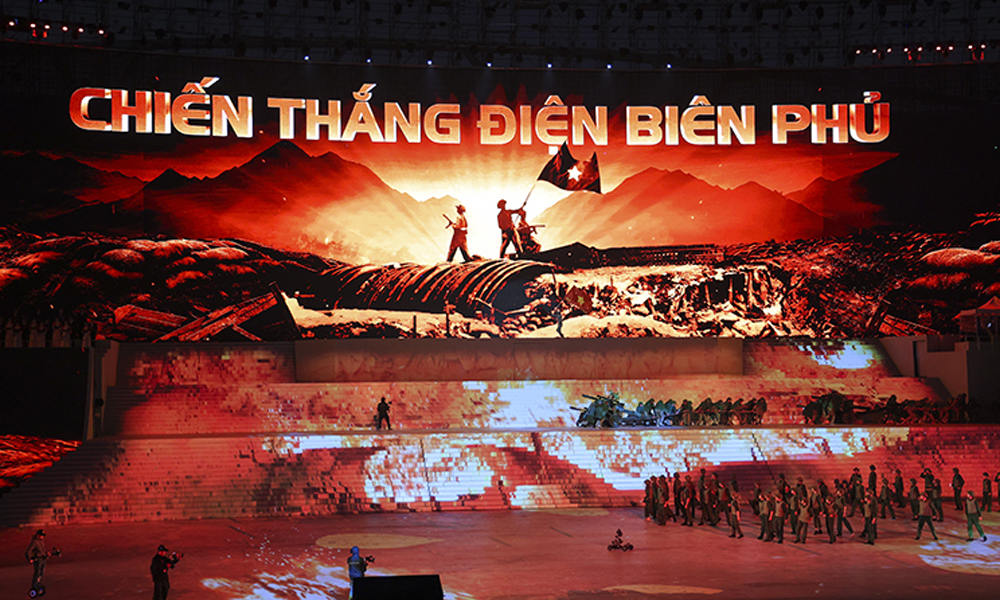 Không gian sân khấu tái hiện Chiến thắng Điện Biên Phủ lịch sử, khắc họa bản lĩnh, trí tuệ và ý chí quật cường của quân và dân Việt Nam. |