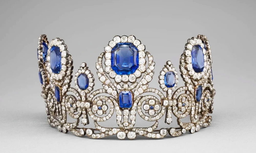 Theo thông tin từ Bảo tàng Louvre, chiếc vương miện được nạm 24 viên sapphire Ceylon và 1.083 viên kim cương tháo rời, trong khi bộ trang sức ngọc lục bảo gồm 32 viên ngọc và hơn 1.100 viên kim cương quý giá.