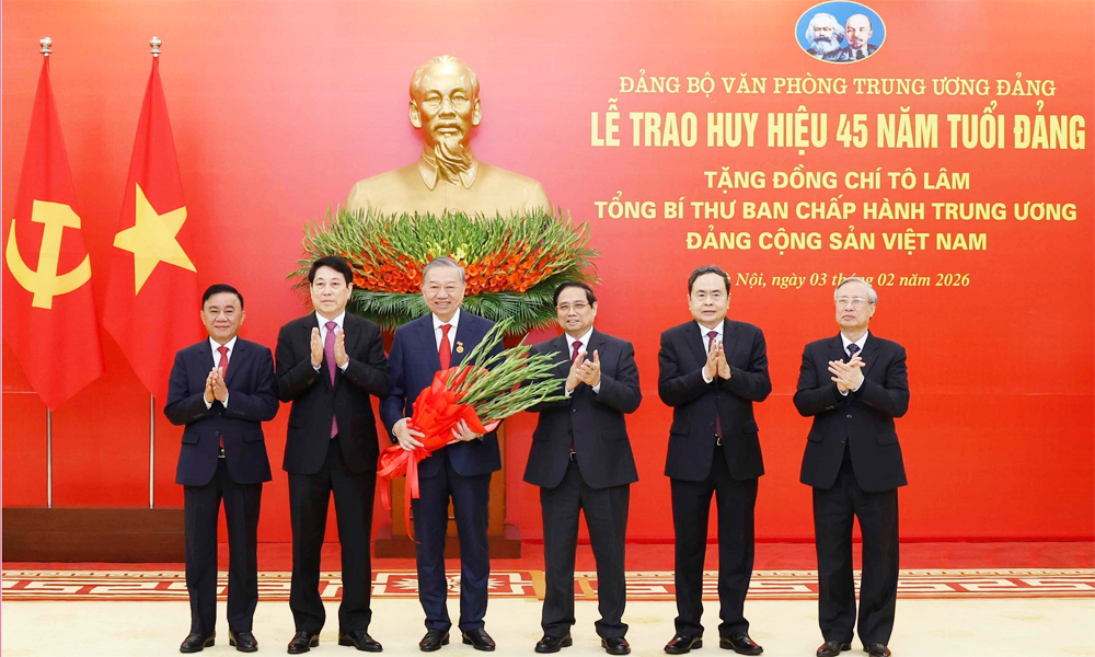 Kỷ niệm 96 năm Ngày thành lập Đảng Cộng sản Việt Nam (3/2/1930-3/2/2026), sáng 3/2, tại Trụ sở Trung ương Đảng, Đảng ủy Văn phòng Trung ương Đảng đã tổ chức Lễ trao Huy hiệu 45 năm tuổi Đảng tặng đồng chí Tô Lâm, Tổng Bí thư Ban Chấp hành Trung ương Đảng Cộng sản Việt Nam.