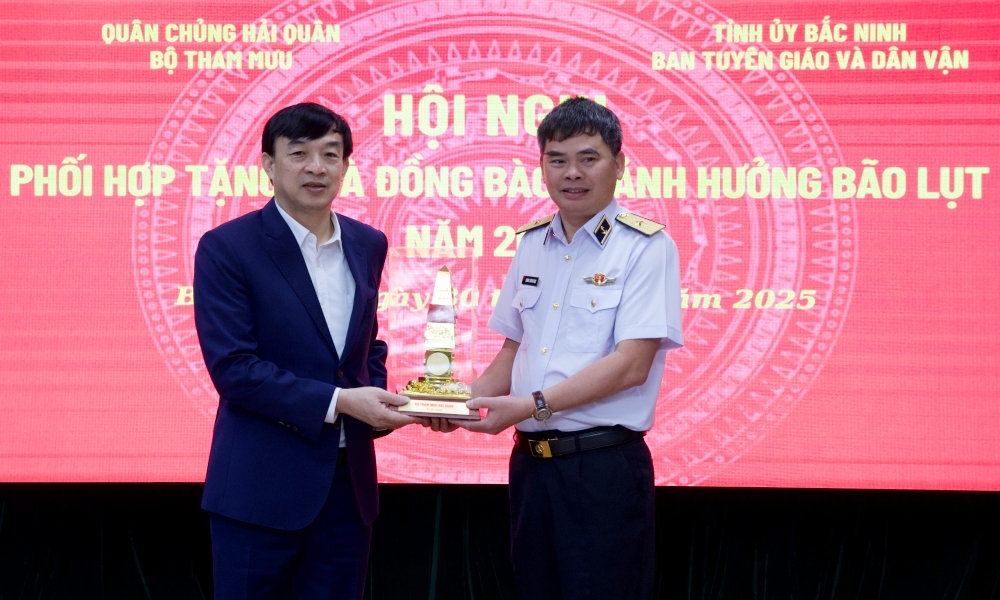 Lãnh đạo Bộ Tham mưu Quân chủng Hải quân trao quà lưu niệm cho lãnh đạo Ban Tuyên giáo và Dân vận Tỉnh ủy. |