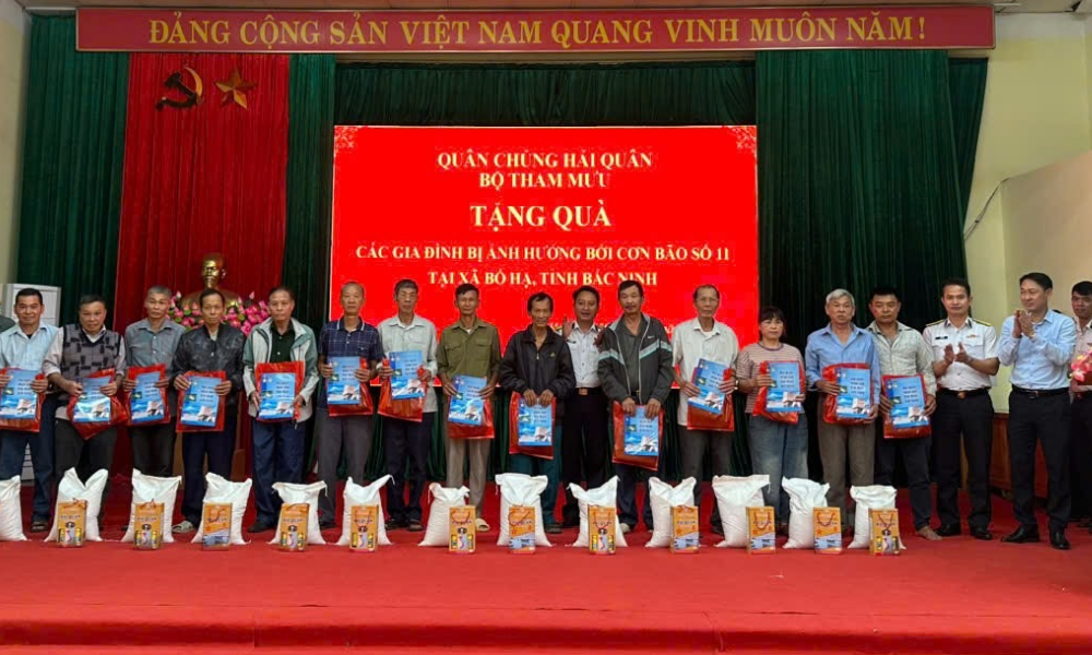BẮC NINH - Sáng 30/10, Bộ Tham mưu Quân chủng Hải quân phối hợp với Ban Tuyên giáo và Dân vận Tỉnh ủy Bắc Ninh tổ chức trao quà cho các gia đình hoàn cảnh khó khăn ở xã Bố Hạ và xã Đồng Kỳ bị ảnh hưởng do bão lụt. Tham dự có các đồng chí: Nguyễn Đình Lợi, Ủy viên Ban Thường vụ Tỉnh uỷ, Trưởng Ban Tuyên giáo và Dân vận Tỉnh ủy; Chuẩn đô đốc, Thiếu tướng Hoàng Lương Ngọc, Phó Tham mưu trưởng Quân chủng Hải quân.
