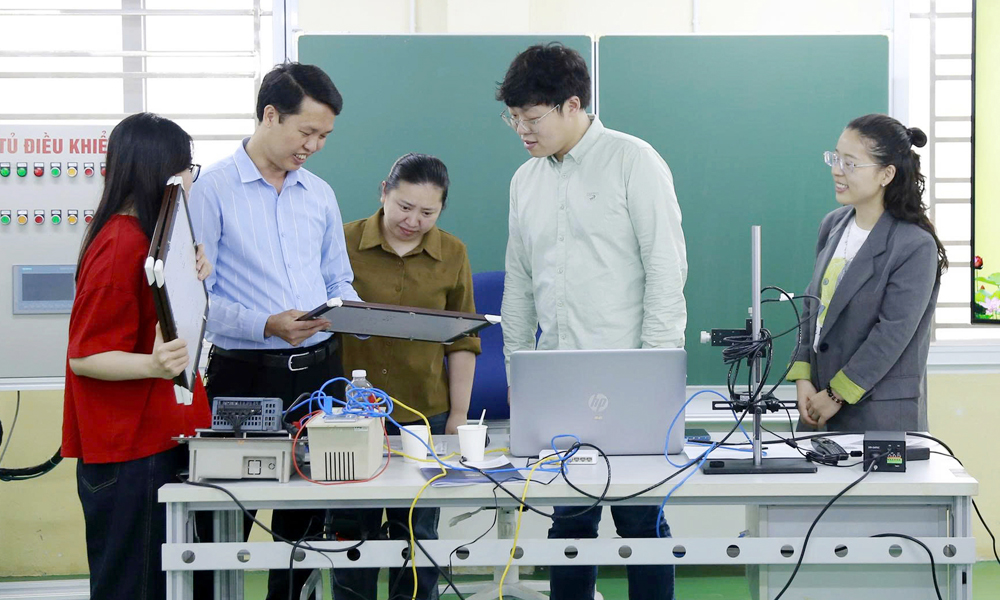 Tiến sĩ Vũ Quang Khuê, Hiệu trưởng Trường Cao đẳng Công nghiệp Bắc Ninh (thứ 2 từ trái sang) tích cực truyền cảm hứng nghiên cứu, sáng tạo kỹ thuật cho sinh viên. |