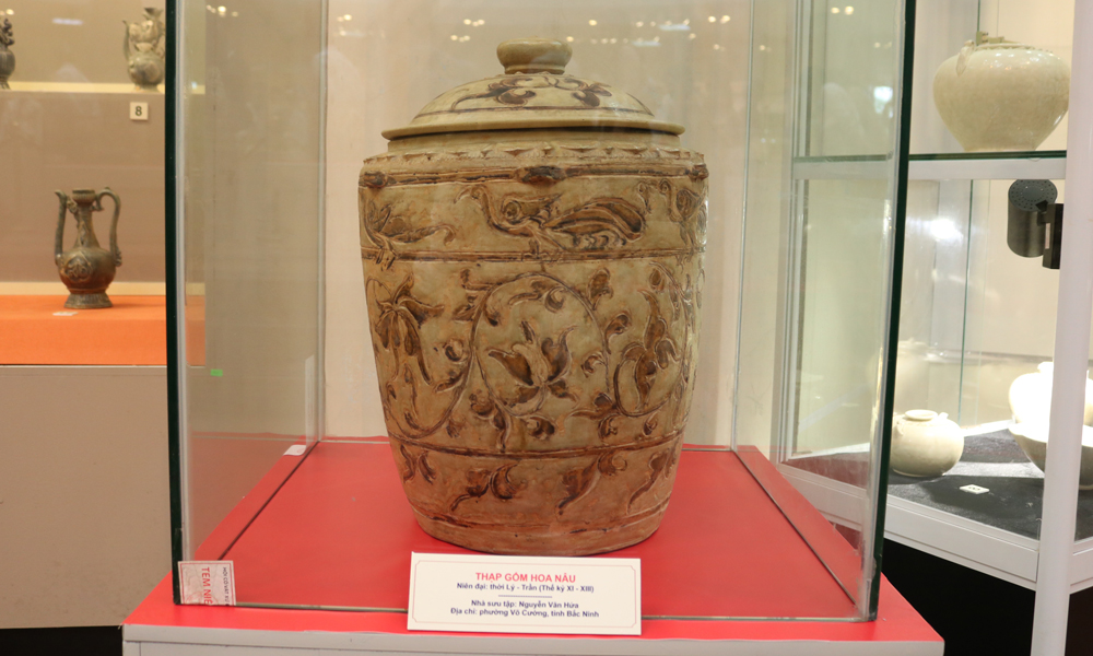 Cổ vật Thạp gốm hoa nâu niên đại thời Lý - Trần tại trưng bày. |
