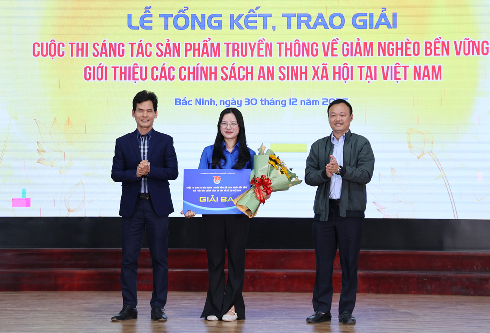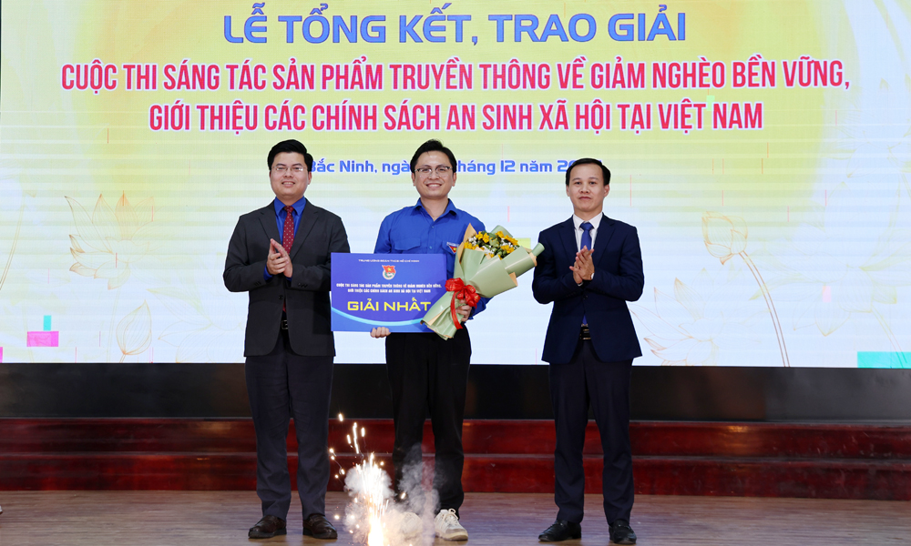 BẮC NINH - Chiều 30/12, tại Trường Cao đẳng Công nghệ Việt - Hàn Bắc Giang (Bắc Ninh), Trung ương Đoàn Thanh niên Cộng sản Hồ Chí Minh tổ chức Lễ tổng kết, trao giải Cuộc thi sáng tác sản phẩm truyền thông về giảm nghèo bền vững và giới thiệu các chính sách an sinh xã hội tại Việt Nam.