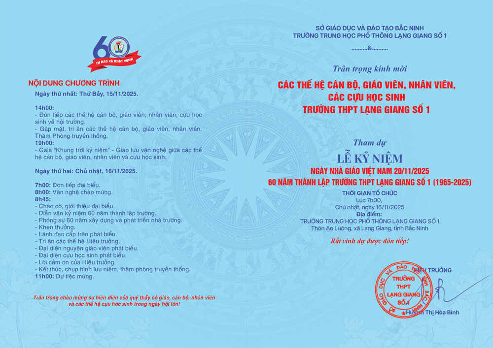 Trường Trung học phổ thông Lạng Giang số 1 mời dự lễ Kỷ niệm Ngày Nhà giáo Việt Nam 20/11/2025; 60 năm thành lập Trường Trung học phổ thông Lạng Giang số 1 (1965-2025).