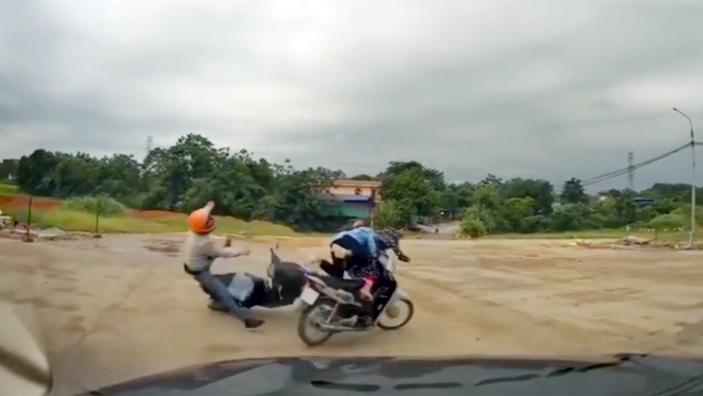 Phanh gấp để tránh chiếc xe ô tô dừng lại đột ngột trước mặt, nam thanh niên đi xe máy đã bị trượt ngã, suýt chút nữa bị chiếc xe ben ngược chiều cán phải…