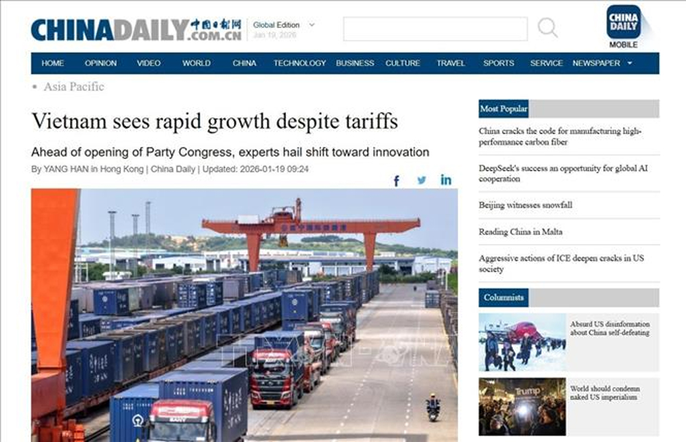 Báo The New York Times của Mỹ trong bài viết ngày 19/1/2026 nhận định Việt Nam là một trong những nền kinh tế năng động nhất châu Á, đồng thời cho rằng Đại hội XIV của Đảng Cộng sản Việt Nam là sự kiện chính trị có ý nghĩa quan trọng trong nhiều thập kỷ, mở ra những cơ hội phát triển và thịnh vượng mới. Hãng tin AP của Mỹ cũng thông tin về sự kiện quan trọng này của Việt Nam cùng những nội dung chính sẽ được các đại biểu thảo luận tại Đại hội.