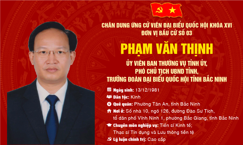 Ứng cử viên Phạm Văn Thịnh cho biết nếu được cử tri tín nhiệm sẽ tập trung tham gia xây dựng và hoàn thiện các cơ chế, chính sách về tài chính - ngân sách, đầu tư công và thu hút đầu tư; bảo đảm việc phân bổ nguồn lực công bằng, minh bạch, hiệu quả; ưu tiên cho các lĩnh vực dân sinh thiết yếu như giáo dục, y tế, an sinh xã hội và bảo vệ môi trường. Ông cũng quan tâm thúc đẩy phát triển kinh tế gắn với phát triển đô thị văn minh, nông nghiệp bền vững, nông nghiệp công nghệ cao; tăng cường đầu tư hạ tầng giao thông, khai thác hiệu quả tiềm năng, lợi thế của địa phương; góp phần nâng cao đời sống Nhân dân và thúc đẩy sự phát triển bền vững của tỉnh.