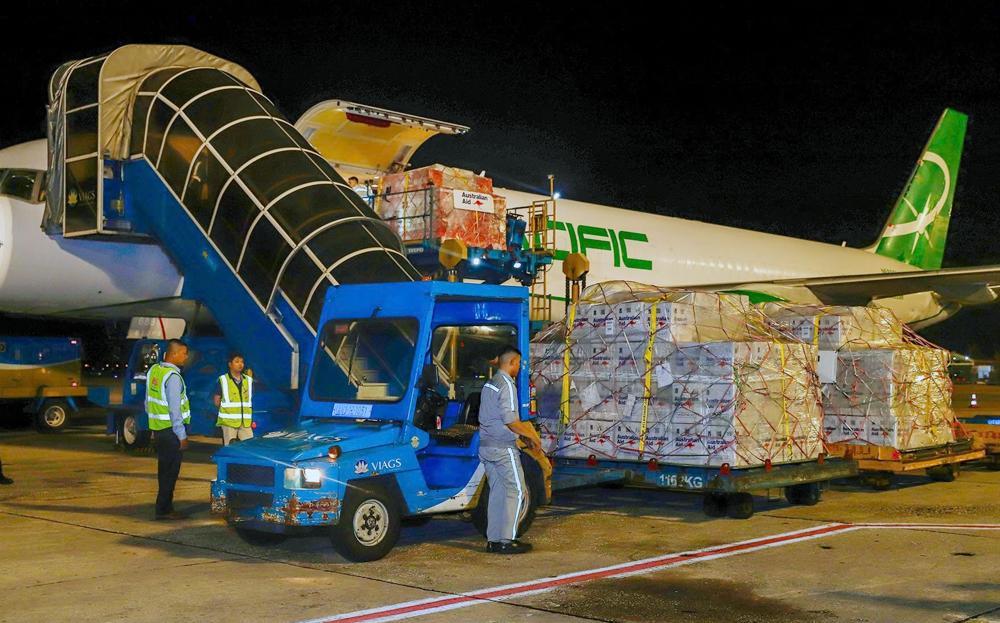 Hàng viện trợ khẩn cấp của Chính phủ Australia cho nhân dân tỉnh Bắc Ninh bị ảnh hưởng bởi thiên tai được vận chuyển xuống sân bay Nội Bài. |