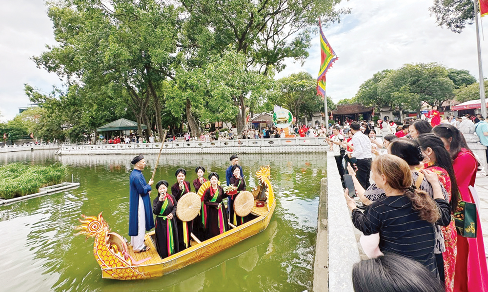 Du khách thưởng thức trình diễn quan họ tại đền Đô (phường Từ Sơn). |