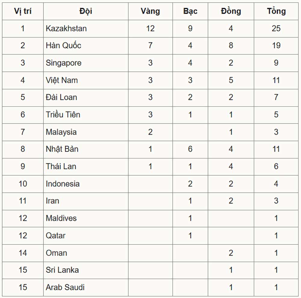 Dẫn đầu bẳng tổng sắp kỳ này là Kazakhstan với 12 Huy chương vàng, 9 Huy chương bạc và 4 Huy chương đồng. Xếp sau là Hàn Quốc (7-4-8) và Singapore (3-4-2).