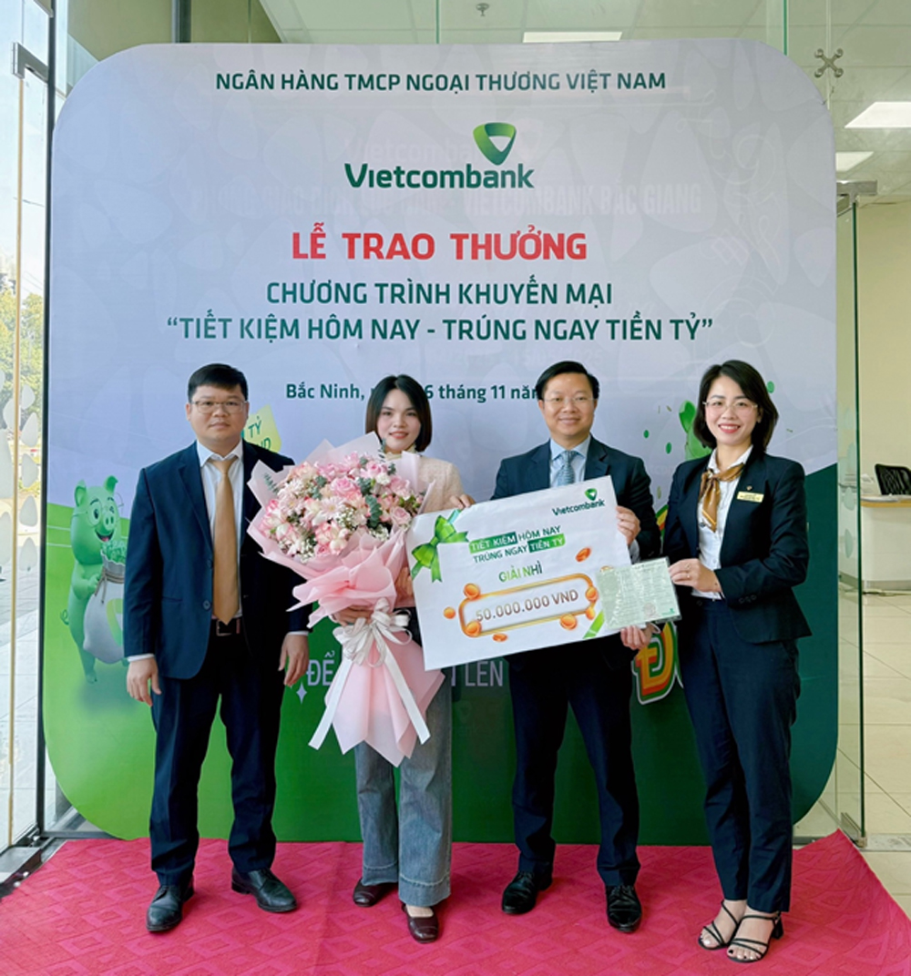 Ngày 26/11/2025, Ngân hàng Thương mại cổ phần Ngoại thương Việt Nam - Chi nhánh Bắc Giang (Vietcombank Bắc Giang) đã tổ chức Lễ trao thưởng Chương trình khuyến mại “Tiết kiệm hôm nay, trúng ngay tiền tỷ” cho khách hàng trúng thưởng.