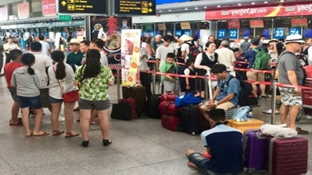 Hành khách chờ làm thủ tục với Vietjet tại sân bay quốc tế Đà Nẵng trưa 15-6. |