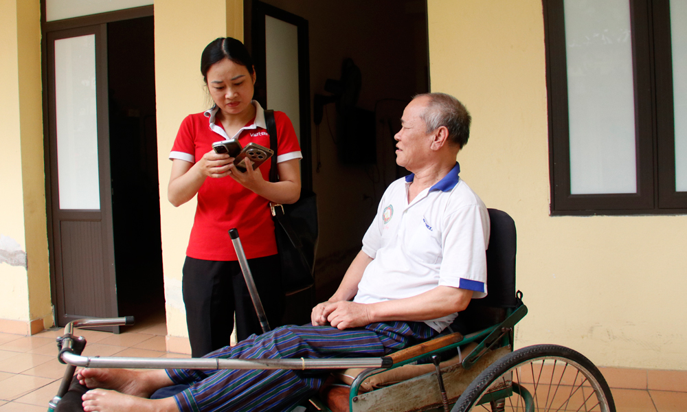 Nhân viên Viettel Bắc Ninh hỗ trợ xác thực thông tin thuê bao cho các thương binh. |