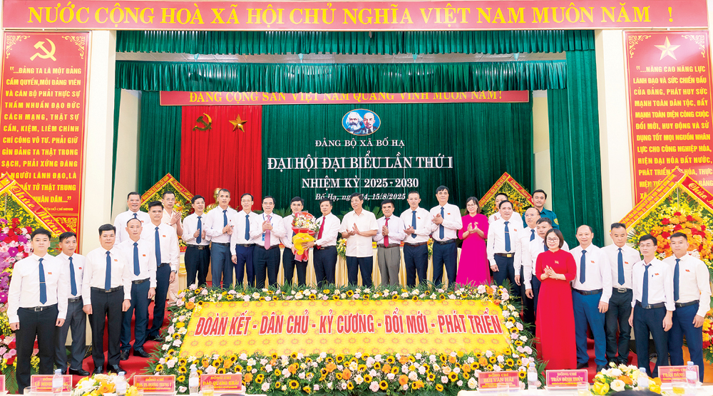 | Đồng chí Đào Quang Khải, Ủy viên Ban Thường vụ Tỉnh ủy, Phó Chủ tịch UBND tỉnh tặng hoa chúc mừng Ban Chấp hành Đảng bộ xã Bố Hạ, nhiệm kỳ 2025 - 2030. |