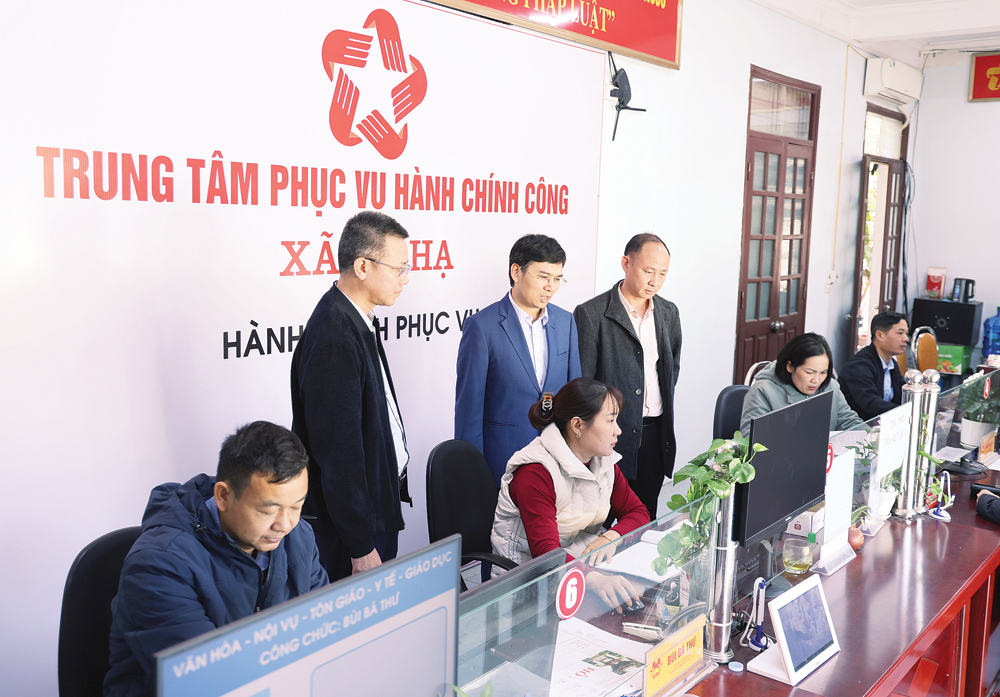 | Các đồng chí: Nguyễn Chí Hiếu, Bí thư Đảng ủy, Chủ tịch HĐND xã Bố Hạ; Nguyễn Đức Dương, Phó Bí thư Đảng ủy, Chủ tịch UBND xã Bố Hạ nắm bắt tình hình hoạt động của Trung tâm Phục vụ hành chính công xã. |