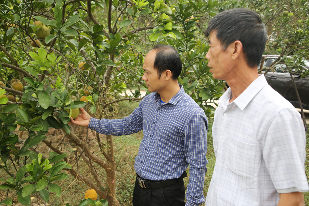 Cán bộ Phòng Kinh tế xã Mỹ Thái hướng dẫn người dân chăm sóc cây ăn quả bị ngập úng sau bão số 11. |