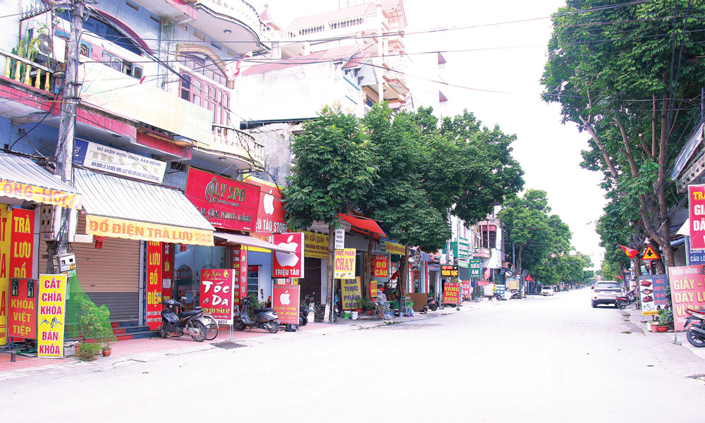 Tận dụng lợi thế Quốc lộ 17, xã khuyến khích phát triển thương mại - dịch vụ. Hệ thống siêu thị, cửa hàng tiện ích hình thành rộng khắp từ trung tâm đến các thôn. Các chợ Ngụ, Tẩy, Bùng được đầu tư cải tạo, đáp ứng tốt nhu cầu lưu thông hàng hóa của Nhân dân. Hiện toàn xã có 1.270 hộ kinh doanh, 3 siêu thị và hơn 20 cửa hàng tiện ích.