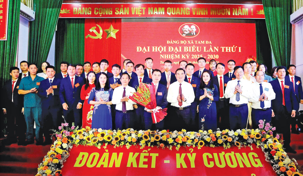Đồng chí Vũ Trí Hải, Ủy viên Ban Thường vụ Tỉnh ủy, Trưởng Ban Nội chính Tỉnh ủy và các đại biểu chúc mừng Ban Chấp hành Đảng bộ xã Tam Đa nhiệm kỳ 2025-2030. |