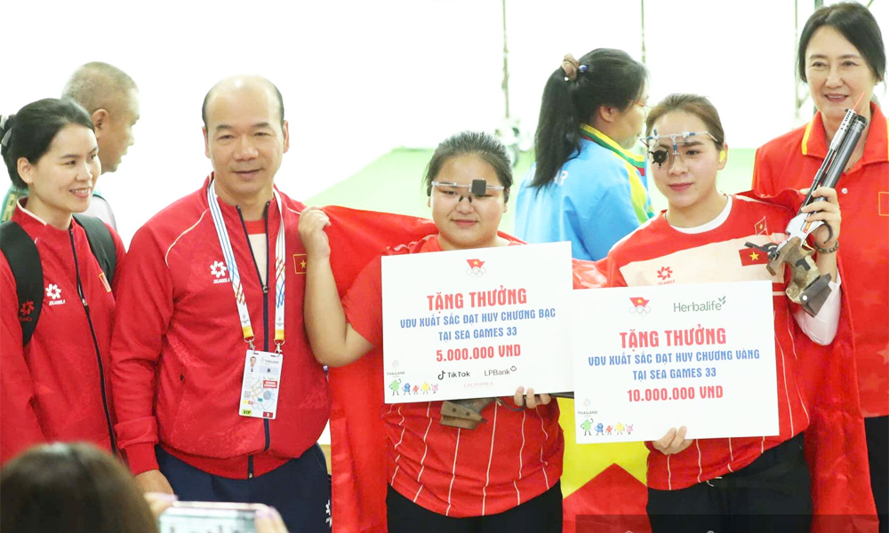 Lãnh đạo đoàn thể thao Việt Nam trao tiền thưởng cho các vận động viên giành huy chương tại SEA Games 33.
