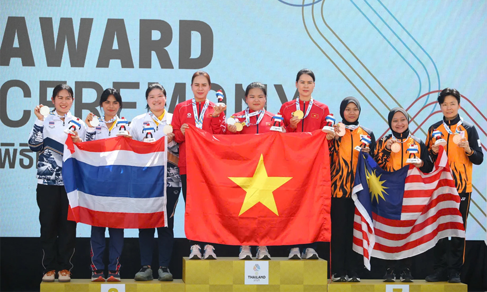 Trịnh Thu Vinh, Nguyễn Thùy Trang và Triệu Thị Hoa Hồng giành Huy chương Vàng thứ 31 cho đoàn Thể thao Việt Nam ở SEA Games 33. |