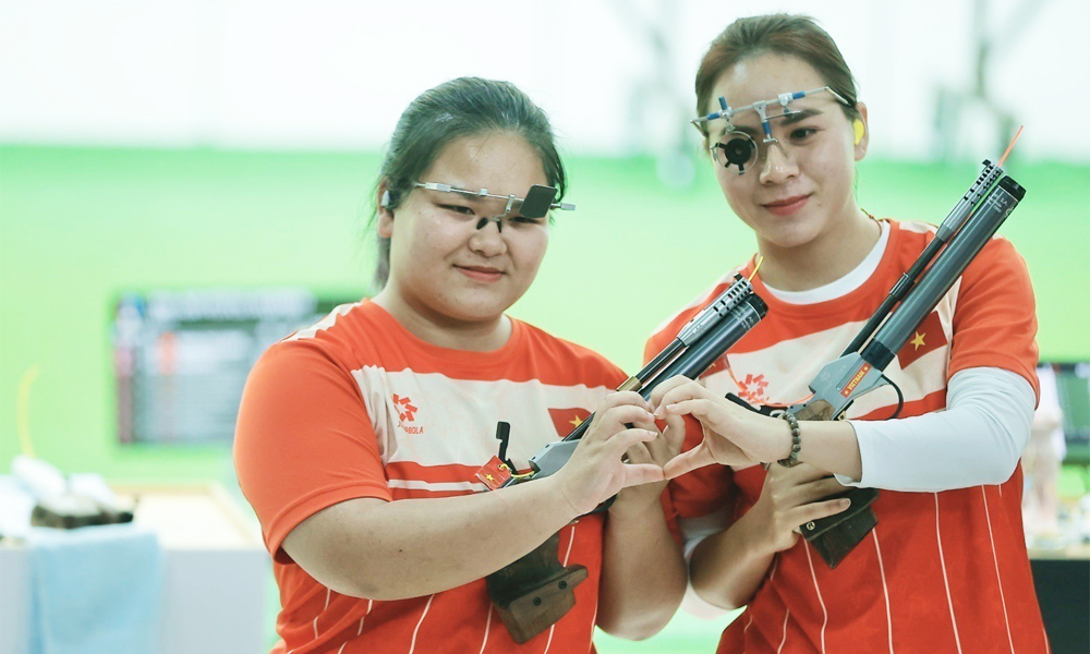 Trịnh Thu Vinh (phải) giành Huy chương Vàng và Nguyễn Thùy Trang giành Huy chương Bạc nội dung cá nhân 10m súng ngắn hơi nữ. |