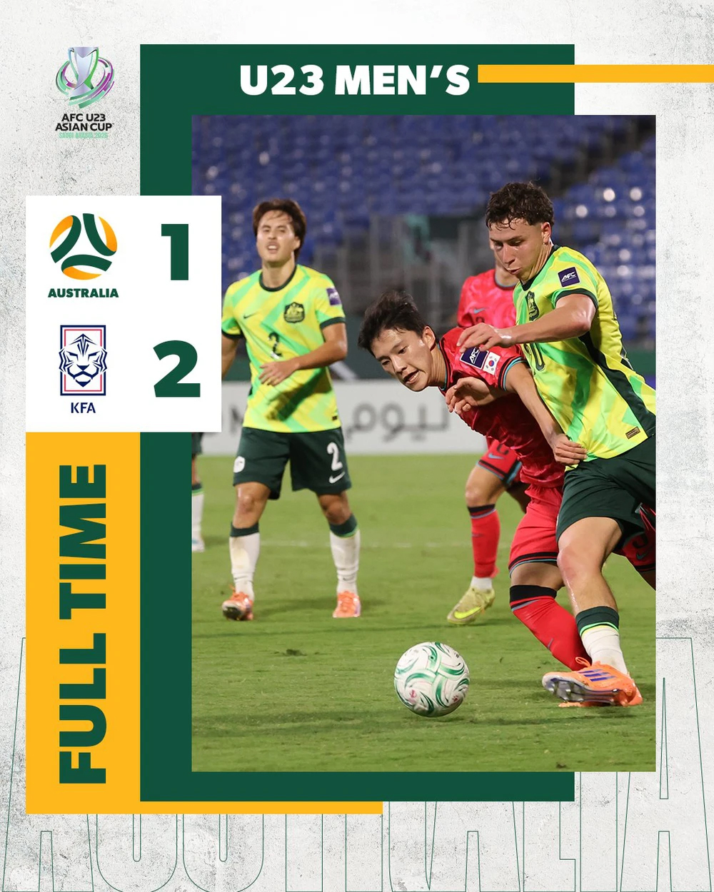 Trận tứ kết U23 châu Á 2026 giữa U23 Australia và U23 Hàn Quốc diễn ra lúc 22 giờ 30 phút ngày 17/1 trên sân Prince Abdullah al-Faisal đã kết thúc với chiến thắng 2-1 dành cho đại diện Đông Á.