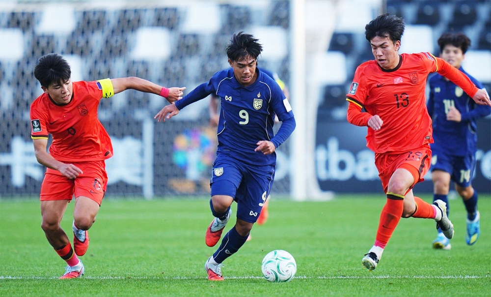 Đội Trung Quốc (áo đỏ) lần đầu góp mặt tại tứ kết châu Á sau khi hòa Thái Lan (áo xanh) ở lượt cuối bảng D ngày 14/1/2026. |