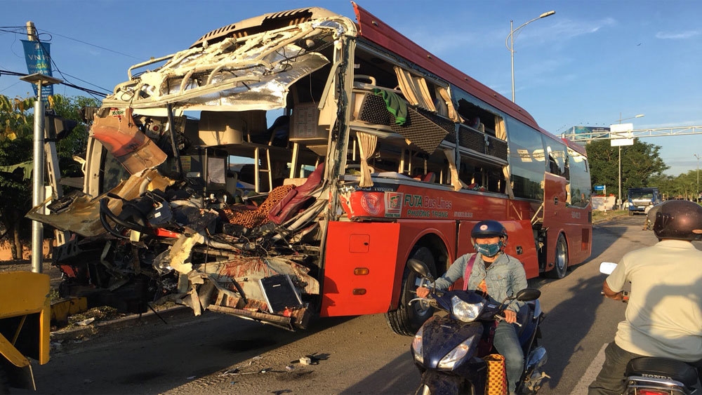 Xe khách đâm xe tải đỗ ven đường, 2 người chết, 14 người bị thương