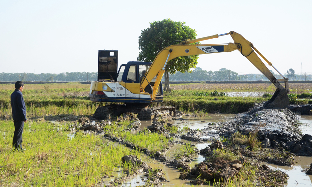 Xã Trung Chính huy động phương tiện cơ giới đẩy nhanh tiến độ làm thủy lợi nội đồng. |