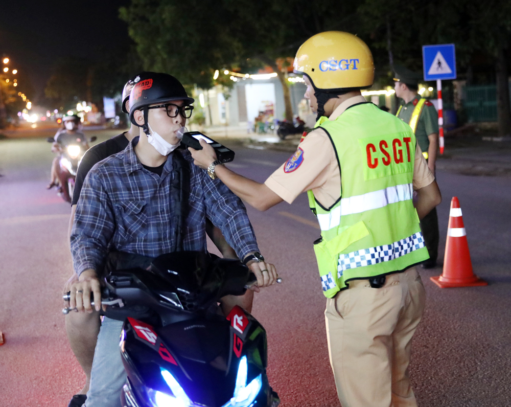 Cảnh sát giao thông huyện Yên Thế kiểm tra nồng độ cồn người điều khiển phương tiện trên đường tỉnh 292. |