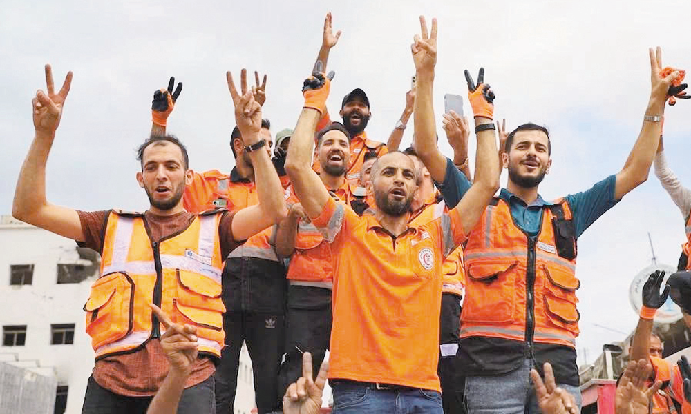Nhân viên cứu hộ Palestine ăn mừng sau khi Tổng thống Mỹ Donald Trump thông báo Israel và Hamas đã đạt được thỏa thuận giai đoạn đầu của lệnh ngừng bắn tại Gaza. Ảnh: Reuters. |