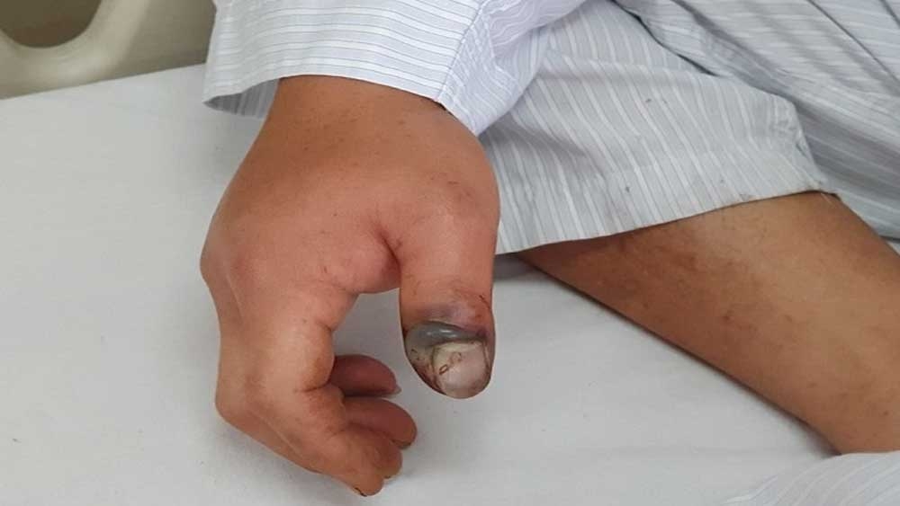 Bệnh nhân nhập viện trong tình trạng bàn tay trái thâm tím, ngón tay thứ 3 phù nề và chảy máu. Người bệnh được các bác sĩ điều trị tích cực theo hướng chống độc, xử lý chống biến chứng. Hiện sức khỏe bệnh nhân tiến triển khá.