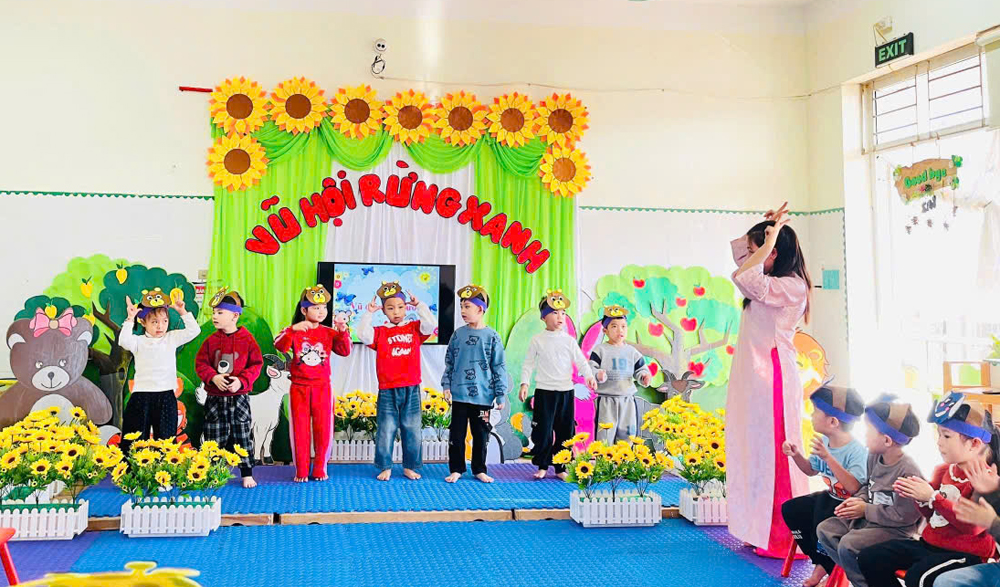 Cô và trò Trường Mầm non Hoàn Sơn 2 (xã Đại Đồng) trong giờ học. |