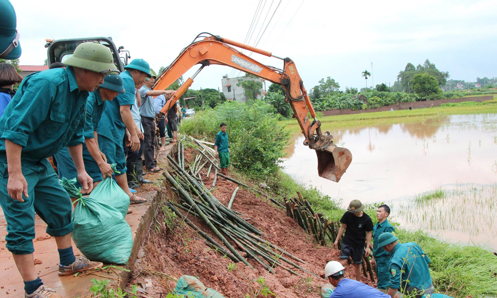 Mưa không ngừng trút xuống song tại xã Mỹ Thái, hơn 100 người dân vẫn khẩn trương khắc phục sự cố sạt lở đê tả Thương, công trình trọng yếu bảo vệ hàng nghìn hộ dân trong vùng. Bà Bùi Thị Hương Lan, Chủ tịch UBND xã cho biết: “Xã duy trì quân số trực 100%, huy động tối đa phương tiện, nhân lực để đắp đất, đóng cọc gia cố đê. Nhờ sự đồng lòng của người dân, đến nay đoạn đê cơ bản đã được xử lý bảo đảm an toàn”.
