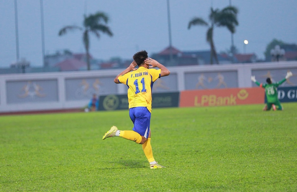 Vũ Xuân Tín ăn mừng bàn thắng “siêu phẩm” vào những phút cuối cùng của trận đấu. |