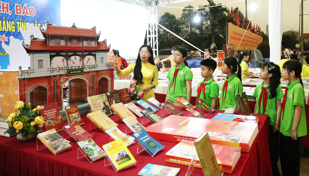 Học sinh tham quan không gian trưng bày, giới thiệu sách. |