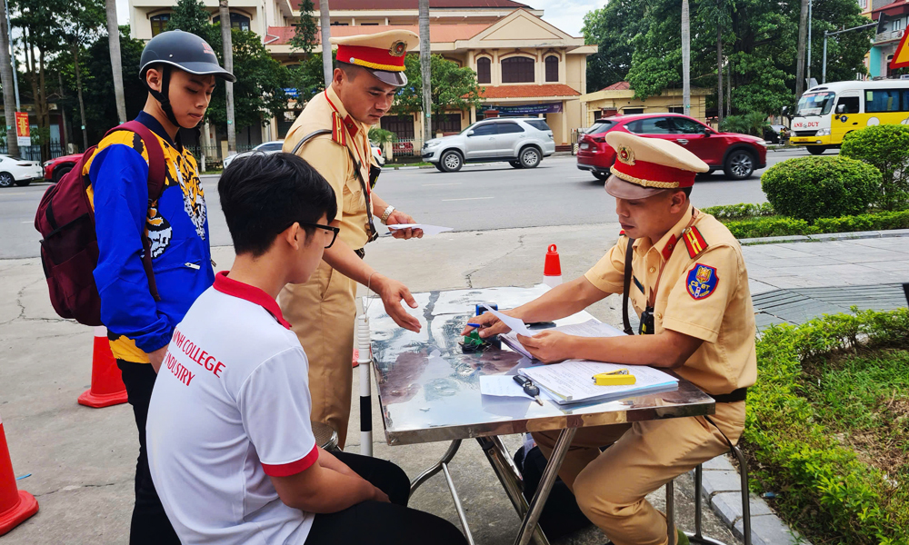 Chốt kiểm tra vi phạm của Phòng Cảnh sát giao thông tại địa bàn phường Võ Cường. |