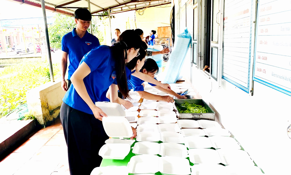 Đoàn viên thanh niên xã Hợp Thịnh chuẩn bị bữa ăn miễn phí phục vụ người dân chịu ảnh hưởng của mưa lũ. |