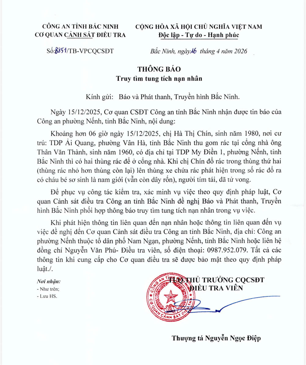 Cơ quan Cảnh sát điều tra Công an tỉnh Bắc Ninh đang phối hợp với các đơn vị liên quan truy tìm tung tích một cháu bé sơ sinh, giới tính nam, đã tử vong, được phát hiện trong thùng rác trên địa bàn phường Nếnh.