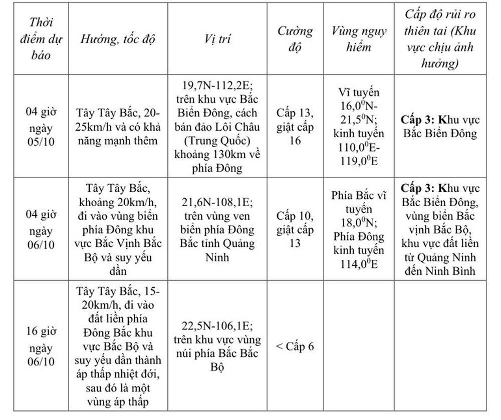 Từ chiều ngày 5/10, vùng biển phía đông khu vực Bắc Vịnh Bắc Bộ (bao gồm đặc khu Bạch Long Vĩ) có gió mạnh dần lên cấp 6 - 7, sau tăng lên cấp 8 - 9. Từ tối ngày 5/10, khu vực bắc Vịnh Bắc Bộ (bao gồm đặc khu Bạch Long Vỹ, Vân Đồn, Cô Tô, Cát Hải và đảo Hòn Dấu) gió mạnh dần lên cấp 8 - 9, sóng biển cao 2 - 4m, vùng gần tâm bão đi qua cấp 10 - 11, giật cấp 14, sóng biển cao 3 - 5m, biển động dữ dội (biển động dữ dội, rất nguy hiểm đối với tàu thuyền).