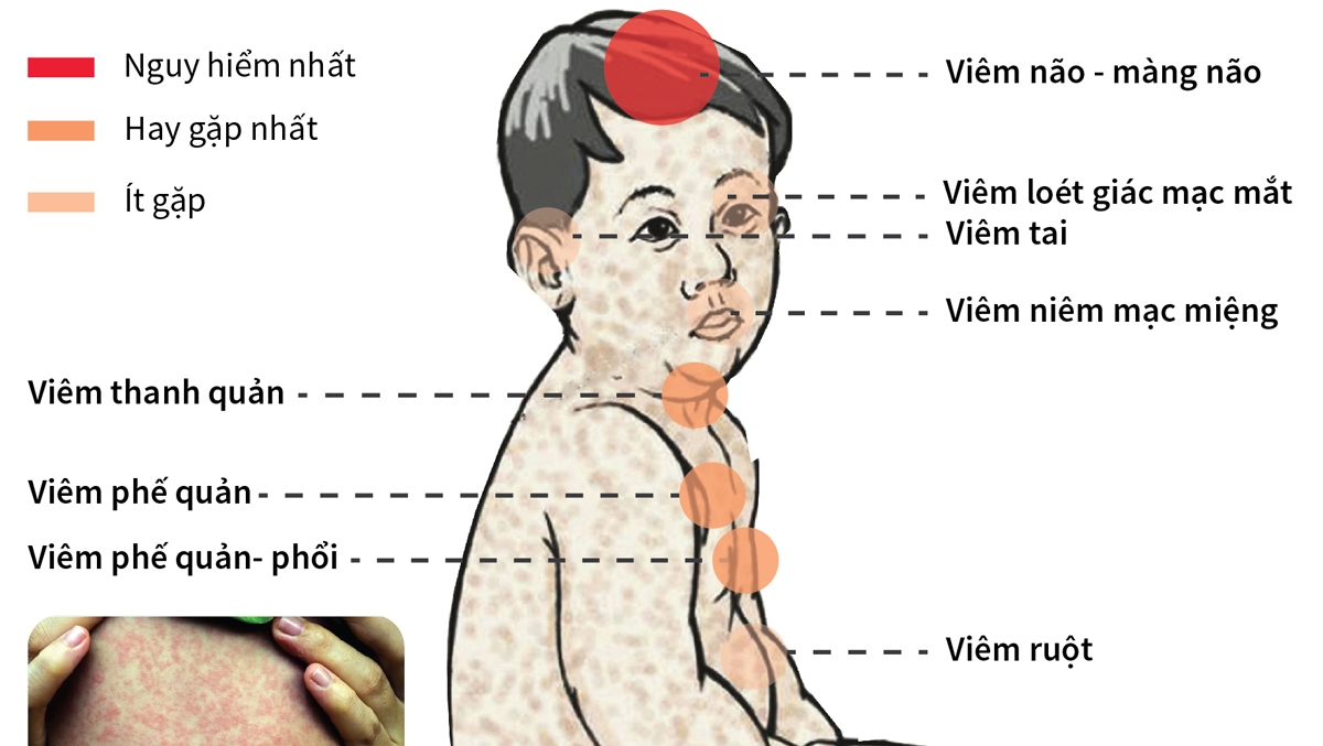 Các bác sĩ điều trị cho biết, biến chứng thường gặp của bệnh sởi là viêm phổi, viêm thanh quản, viêm kết mạc, mù lòa, viêm não, hôn mê, co giật, nguy cơ tử vong cao vì bội nhiễm. Nguy hiểm hơn khi thai phụ mắc sởi có thể dẫn đến sinh non hoặc thai chết lưu.