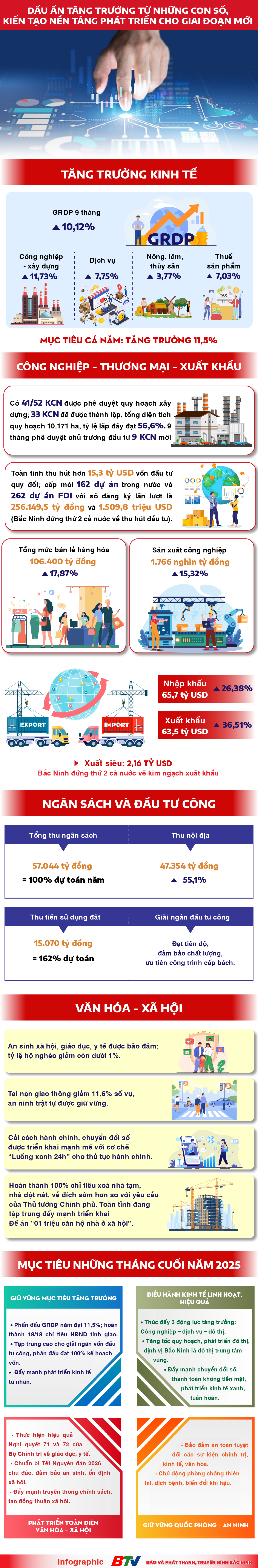BẮC NINH - 9 tháng năm 2025, kinh tế - xã hội tỉnh Bắc Ninh tiếp tục ghi nhận nhiều điểm sáng, giữ vững vị thế cực tăng trưởng năng động của vùng Thủ đô Hà Nội. Bước vào chặng “nước rút” cuối năm, toàn tỉnh đang tăng tốc thực hiện các giải pháp trọng tâm, quyết tâm cao nhất hoàn thành mục tiêu tăng trưởng 11,5%, tạo nền tảng vững chắc cho giai đoạn phát triển mới.