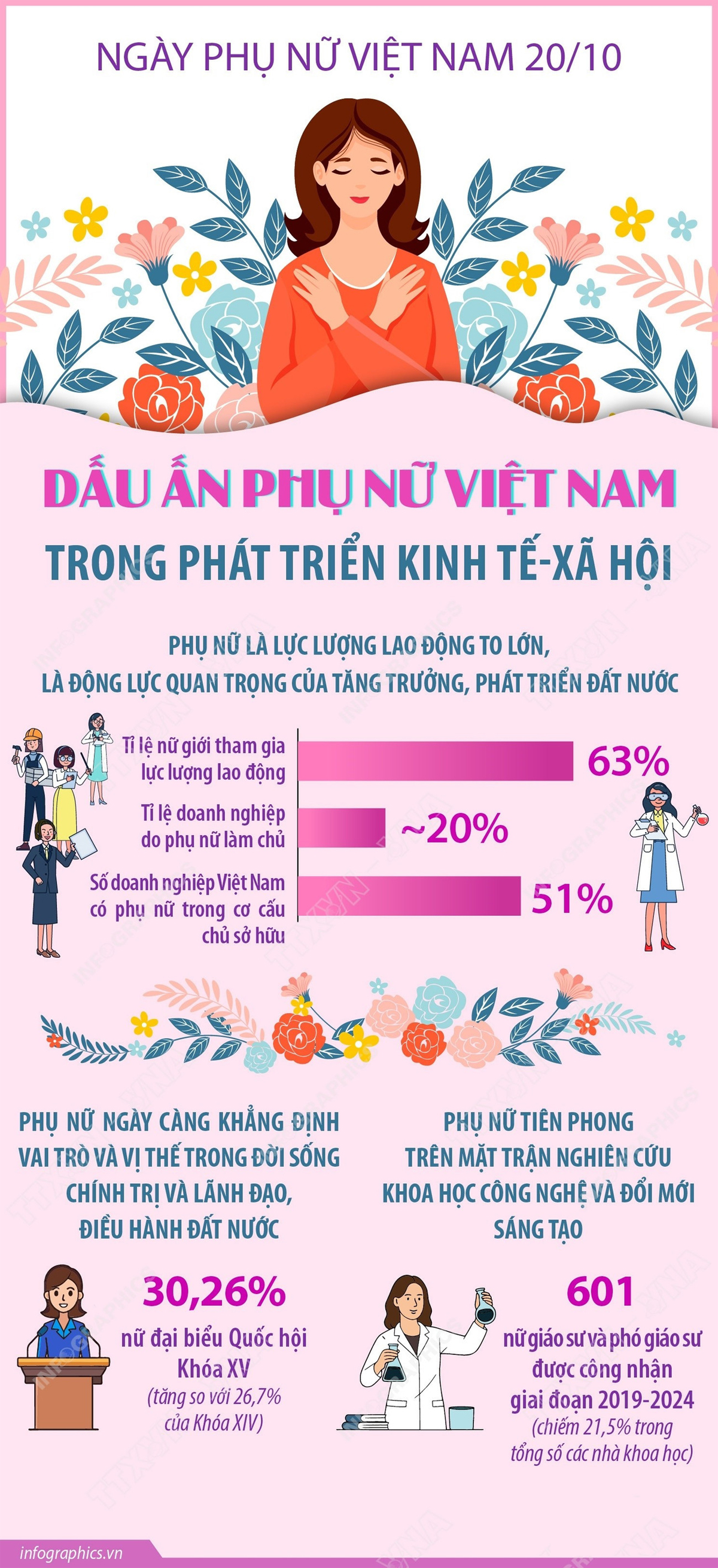 Với 63% tham gia lực lượng lao động và 51% doanh nghiệp có phụ nữ trong cơ cấu chủ sở hữu, phụ nữ Việt Nam ngày càng khẳng định vai trò quan trọng trong phát triển kinh tế - xã hội và hội nhập quốc tế.