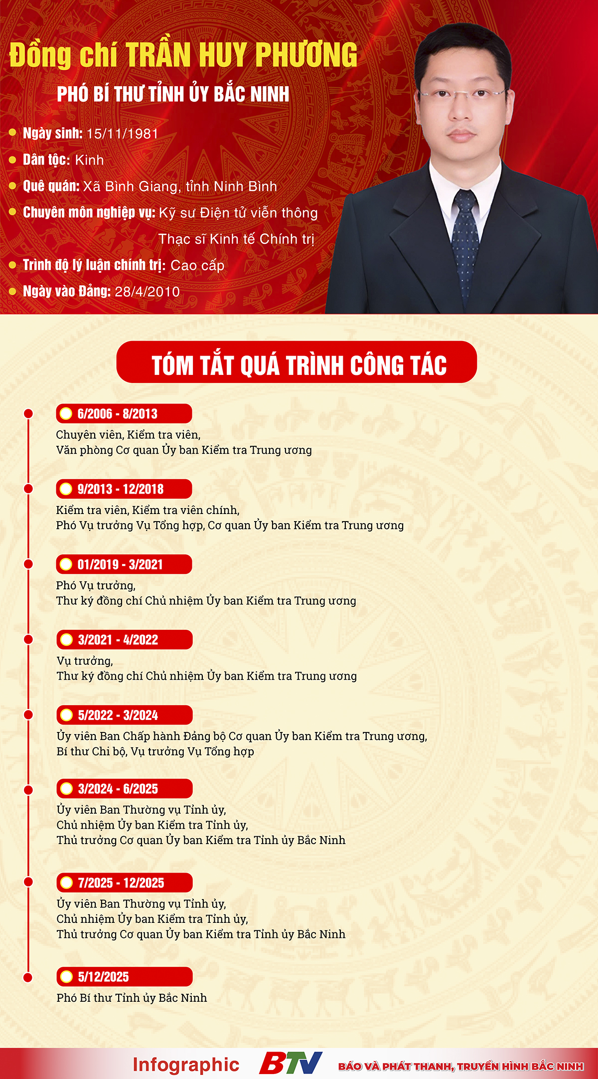BẮC NINH - Ngày 5/12, tại hội nghị Ban chấp hành Đảng bộ tỉnh lần thứ hai, khóa I, nhiệm kỳ 2025 - 2030, Ban Thường vụ Tỉnh ủy trình Ban Chấp hành Đảng bộ tỉnh xem xét, quyết định bầu chức danh Phó Bí thư Tỉnh ủy Bắc Ninh, nhiệm kỳ 2025 - 2030 đối với đồng chí Trần Huy Phương, Ủy viên Ban Thường vụ Tỉnh ủy, Chủ nhiệm Ủy ban Kiểm tra Tỉnh ủy Bắc Ninh, với 100% số phiếu bầu. Báo và Phát thanh, Truyền hình Bắc Ninh trân trọng giới thiệu quá trình công tác của đồng chí Trần Huy Phương.