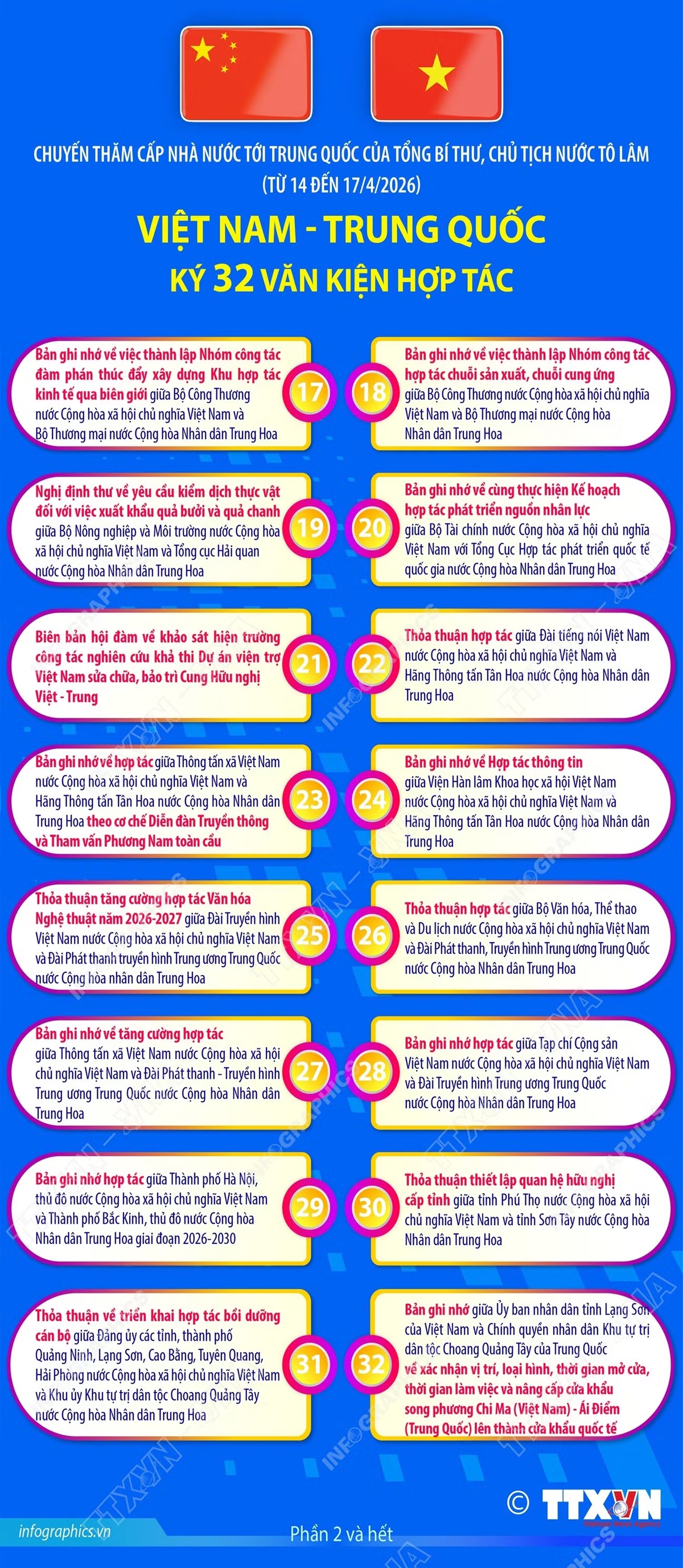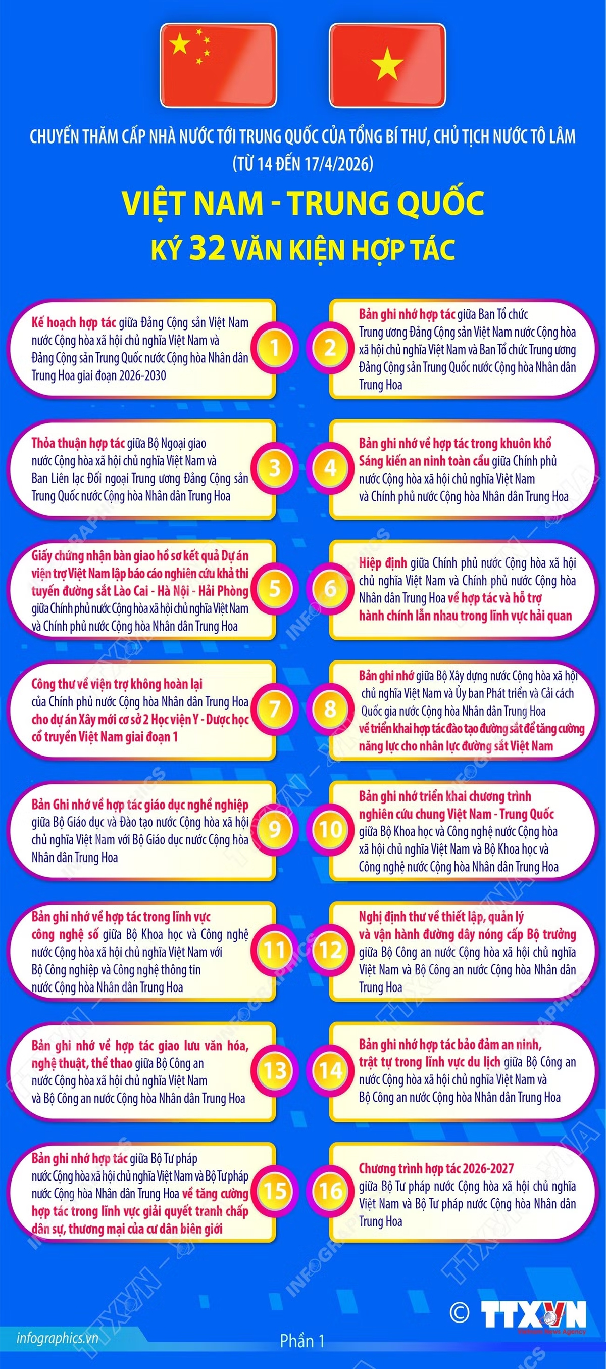 Trong khuôn khổ chuyến thăm cấp Nhà nước tới Trung Quốc của Tổng Bí thư, Chủ tịch nước Tô Lâm cùng Phu nhân và Đoàn đại biểu cấp cao Việt Nam, hai bên đã ký 32 văn kiện hợp tác trong các lĩnh vực.